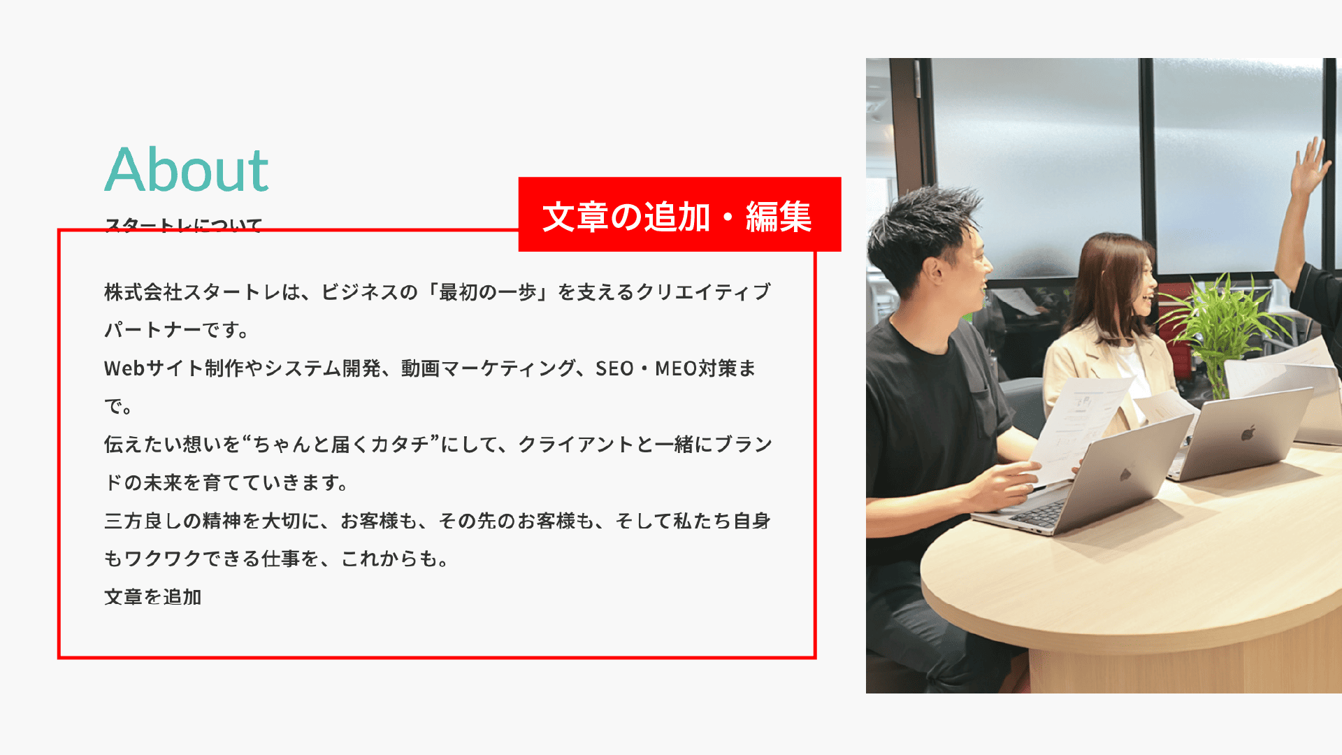 HP 内の既に文字や文章が入っている部分は、お客様ご自身での編集が可能となります。 ※テキストが元から入っていない箇所に文字や文章を追加することはできません。
