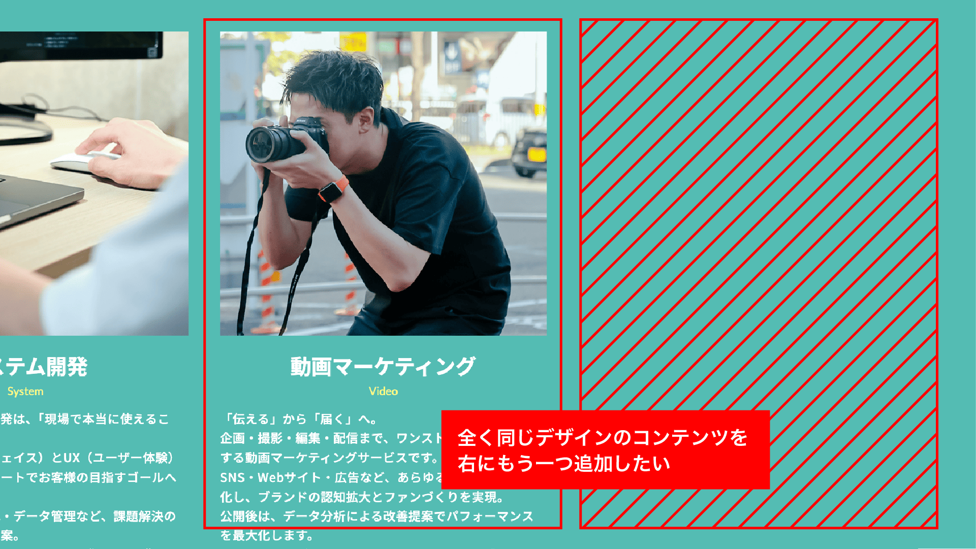 HP 内のコンテンツを複製(全く同じデザインのコンテンツの追加)することはできません。 ※コンテンツの追加をご希望の場合は弊社にて有料での対応となります。内容によって料金は異なりますので、まずはお問い合わせください。