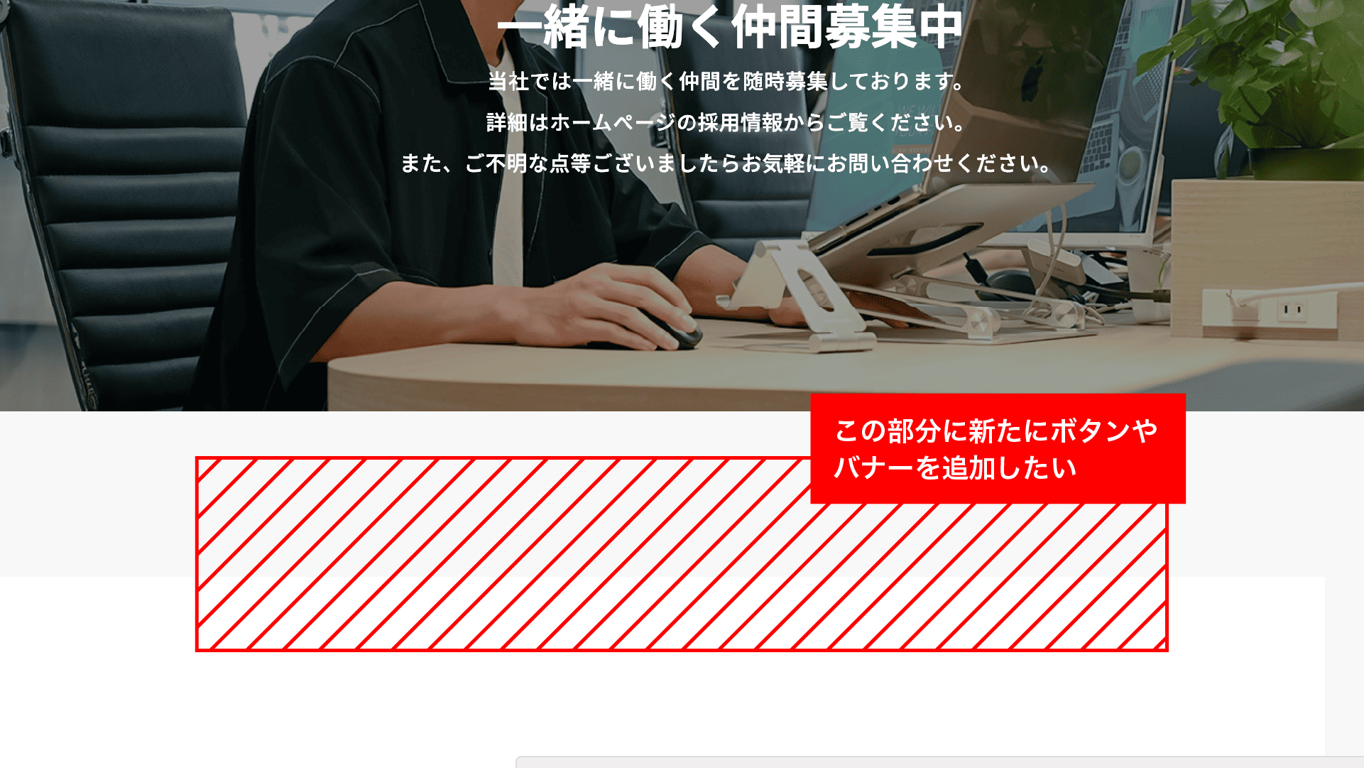 HP 内に新たにボタンやバナーなどの新たなコンテンツの追加をすることはできません。 ※コンテンツの追加をご希望の場合は弊社にて有料での対応となります。内容によって料金は異なりますので、まずはお問い合わせください。
