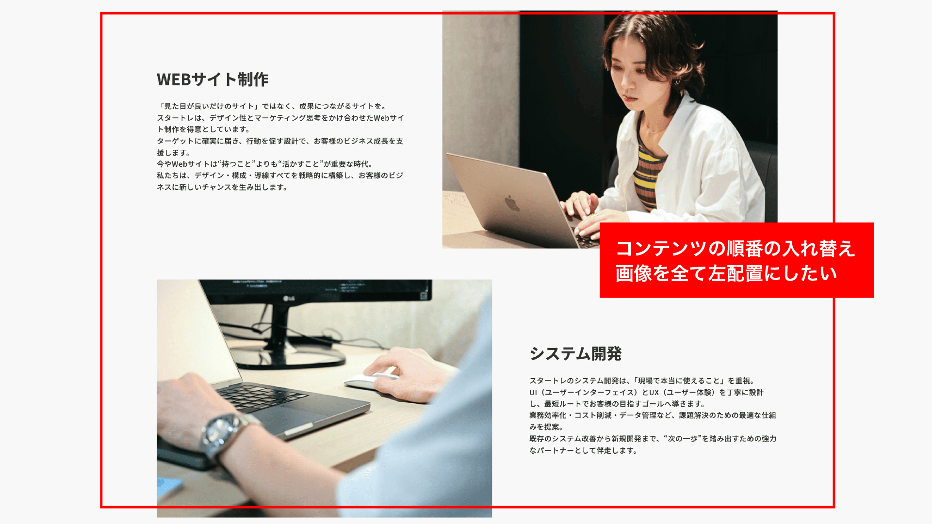 コンテンツの順番を入れ替えたり、表示場所を変更するといったレイアウトの変更はできません。 ※レイアウトを変更をご希望の場合は弊社にて有料での対応となります。内容によって料金は異なりますので、まずはお問い合わせください。