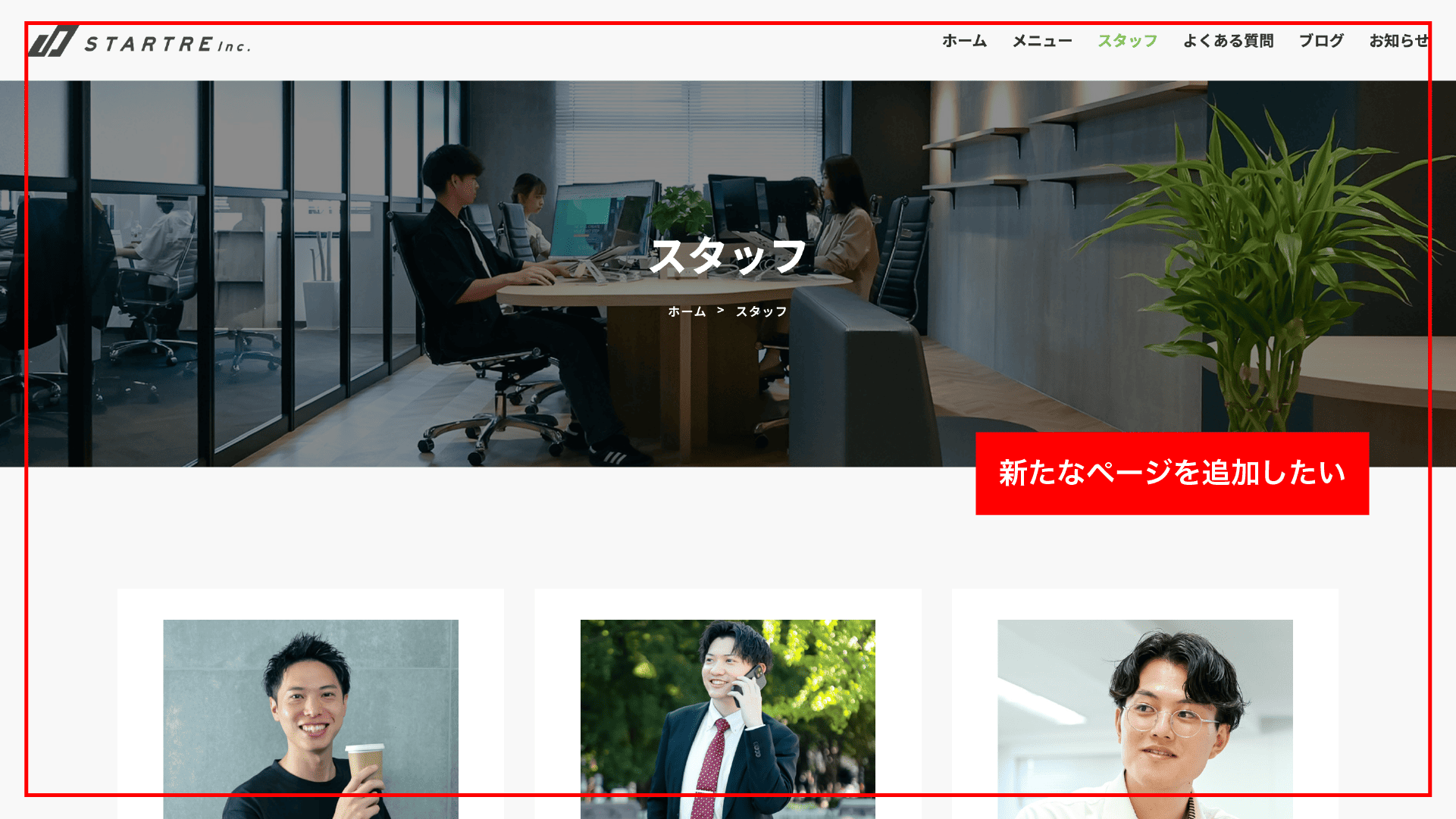 HP 内に新たにページを追加することはできません。 ※ページの追加をご希望の場合は弊社にて有料での対応となります。内容によって料金は異なりますので、まずはお問い合わせください。