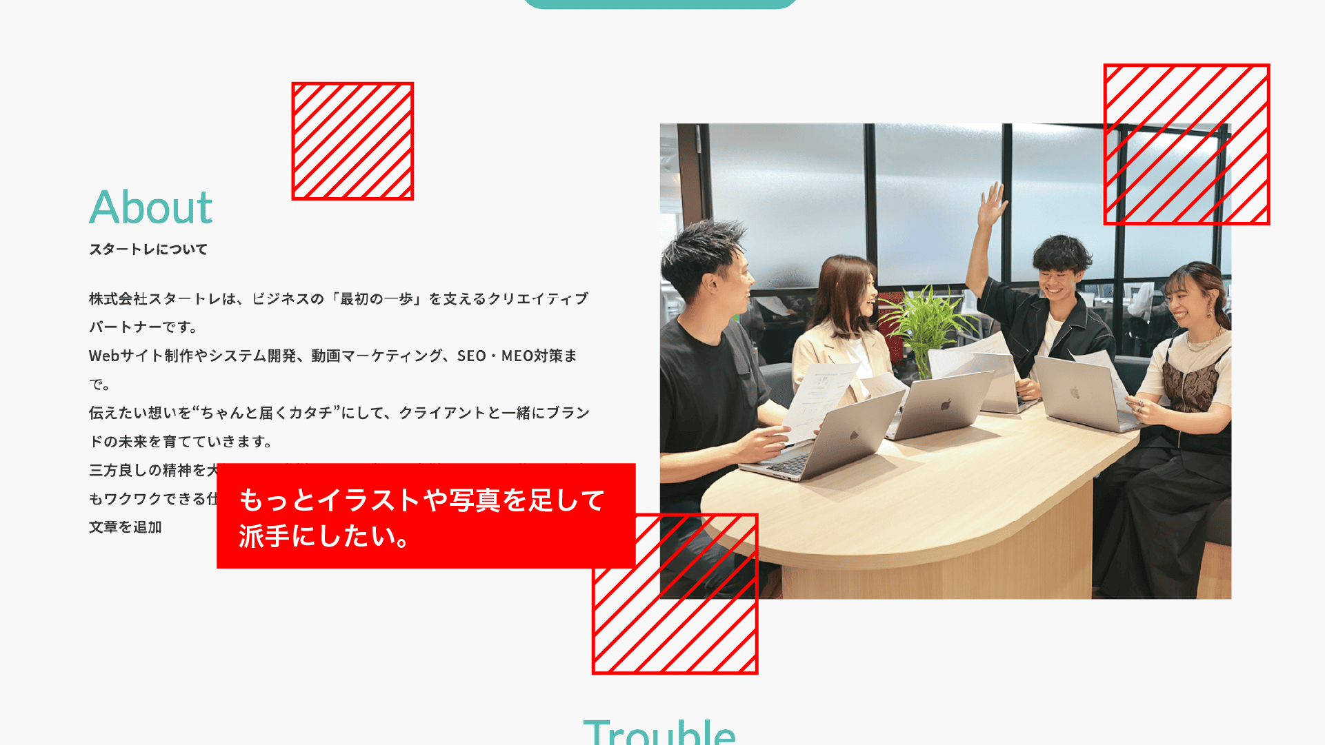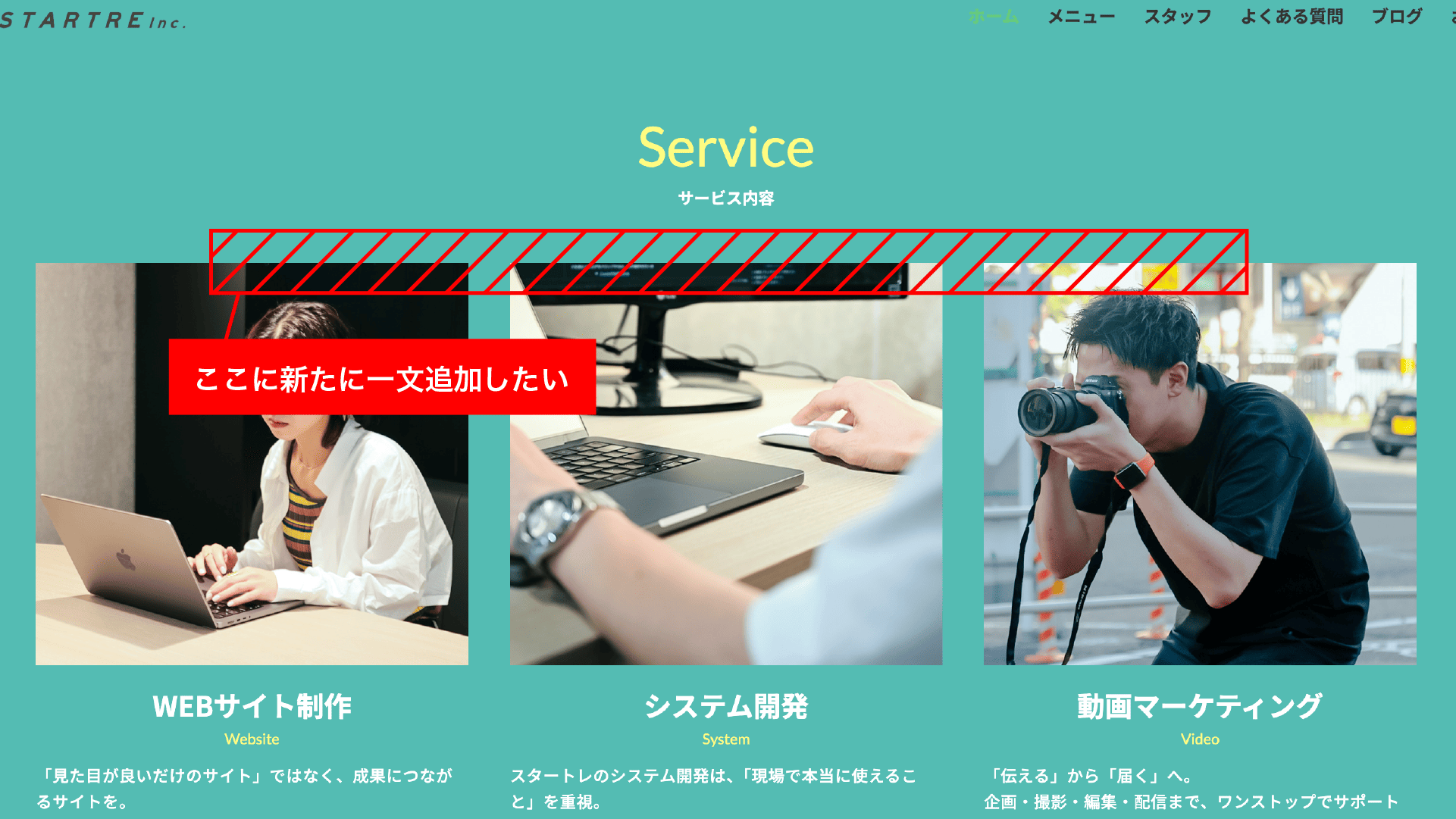 HP 内ではじめ(完成時)からテキストが入っていない箇所に新たに見出しや文章を追加することはできません。 ※テキストの追加をご希望の場合は弊社にて有料での対応となります。内容によって料金は異なりますので、まずはお問い合わせください。