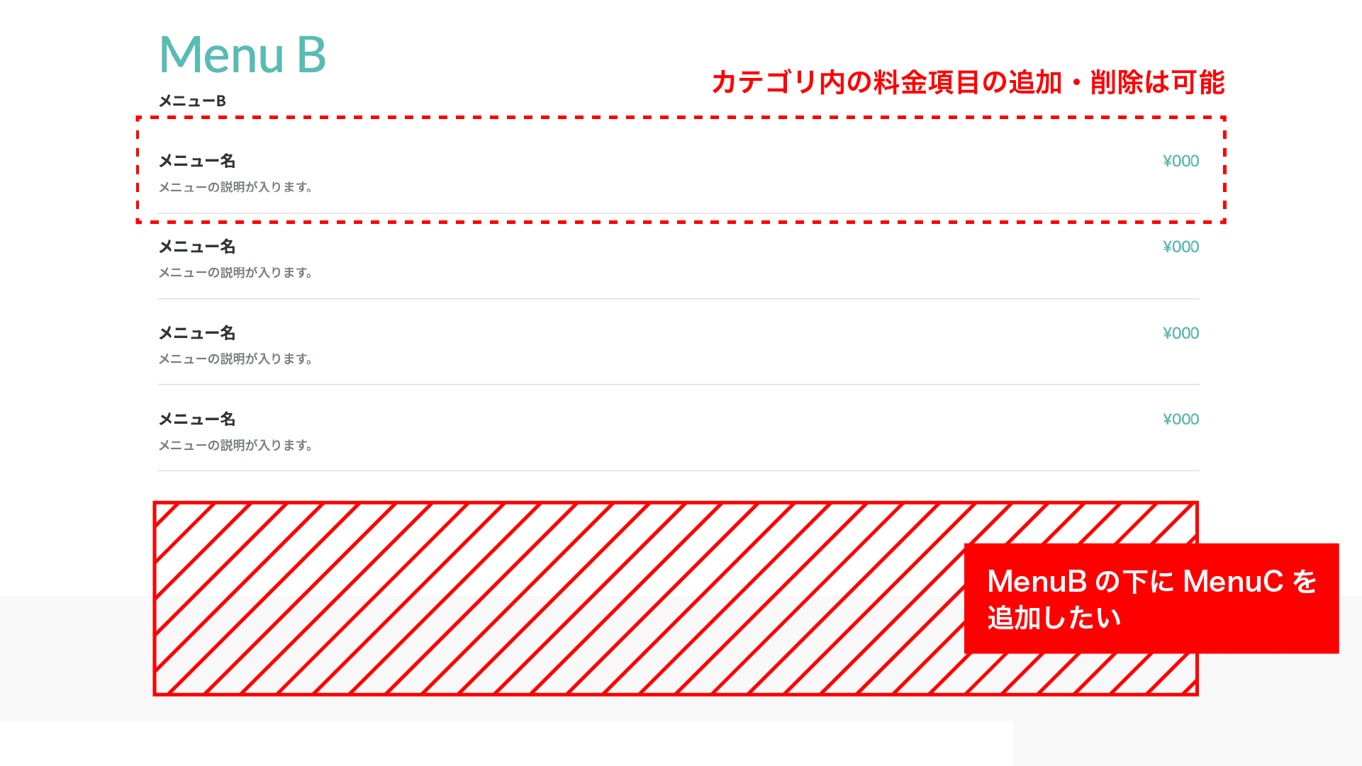 メニューのカテゴリ追加はコンテンツの追加となるため、追加できません。 ※カテゴリ追加をご希望の場合は弊社での対応となります。原稿確定後のカテゴリ追加5個まで無料。(6個目から有料での対応)また弊社にて用意するのはカテゴリ枠までとなります。メニュー名や料金等はお客様ご自身での追加をお願いいたします。