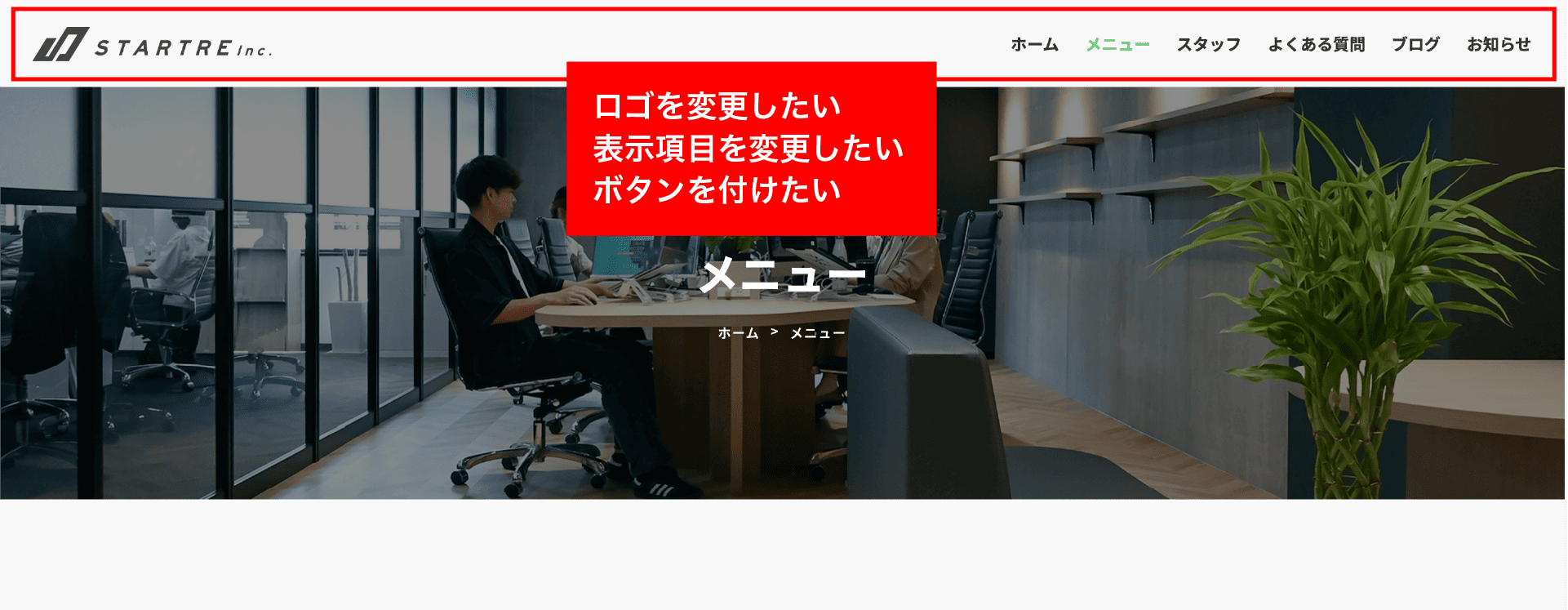 ヘッダー部分(下赤枠)のコンテンツや内容を変更することはできません。 全ページ共通で表示される項目は編集不可となります。 ※ヘッダー部分の変更をご希望の場合は弊社にて有料での対応となります。内容によって料金は異なりますので、まずはお問い合わせください。