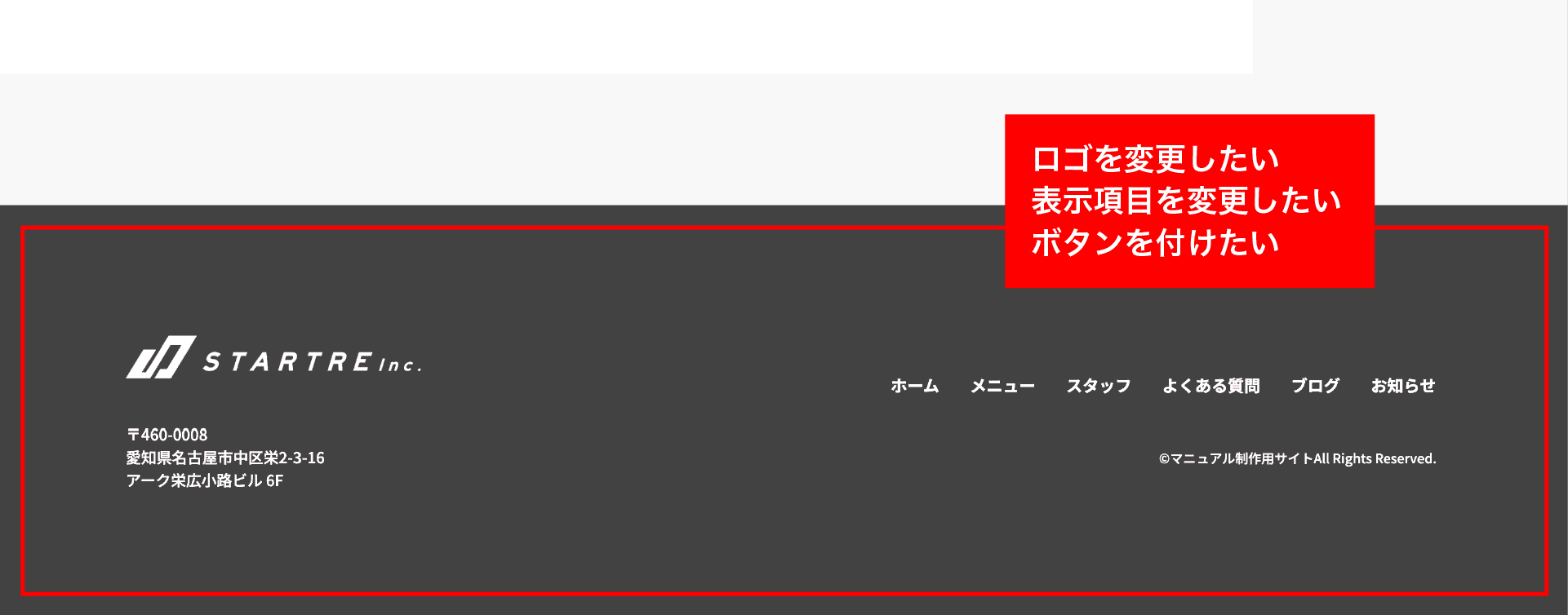 フッター部分(下赤枠)のコンテンツや内容を変更することはできません。 全ページ共通で表示される項目は編集不可となります。 ※フッター部分の変更をご希望の場合は弊社にて有料での対応となります。内容によって料金は異なりますので、まずはお問い合わせください。