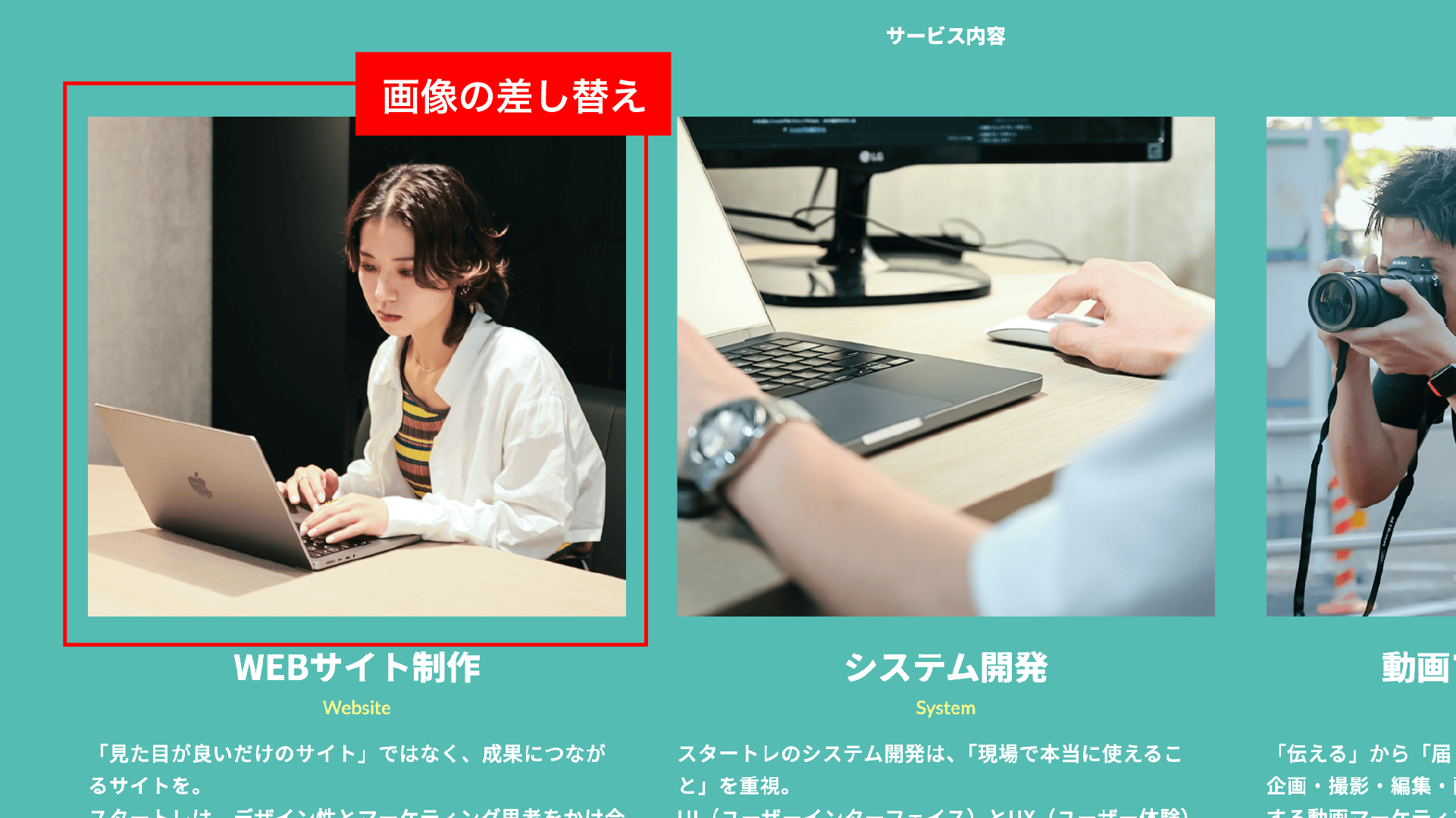 HP 内の既に画像が入っている部分は、お客様ご自身での編集が可能となります。 ※画像が元から入っていない箇所に画像を追加することはできません。 ※背景透過など特殊な加工が施してある画像を差し替えることはできません。