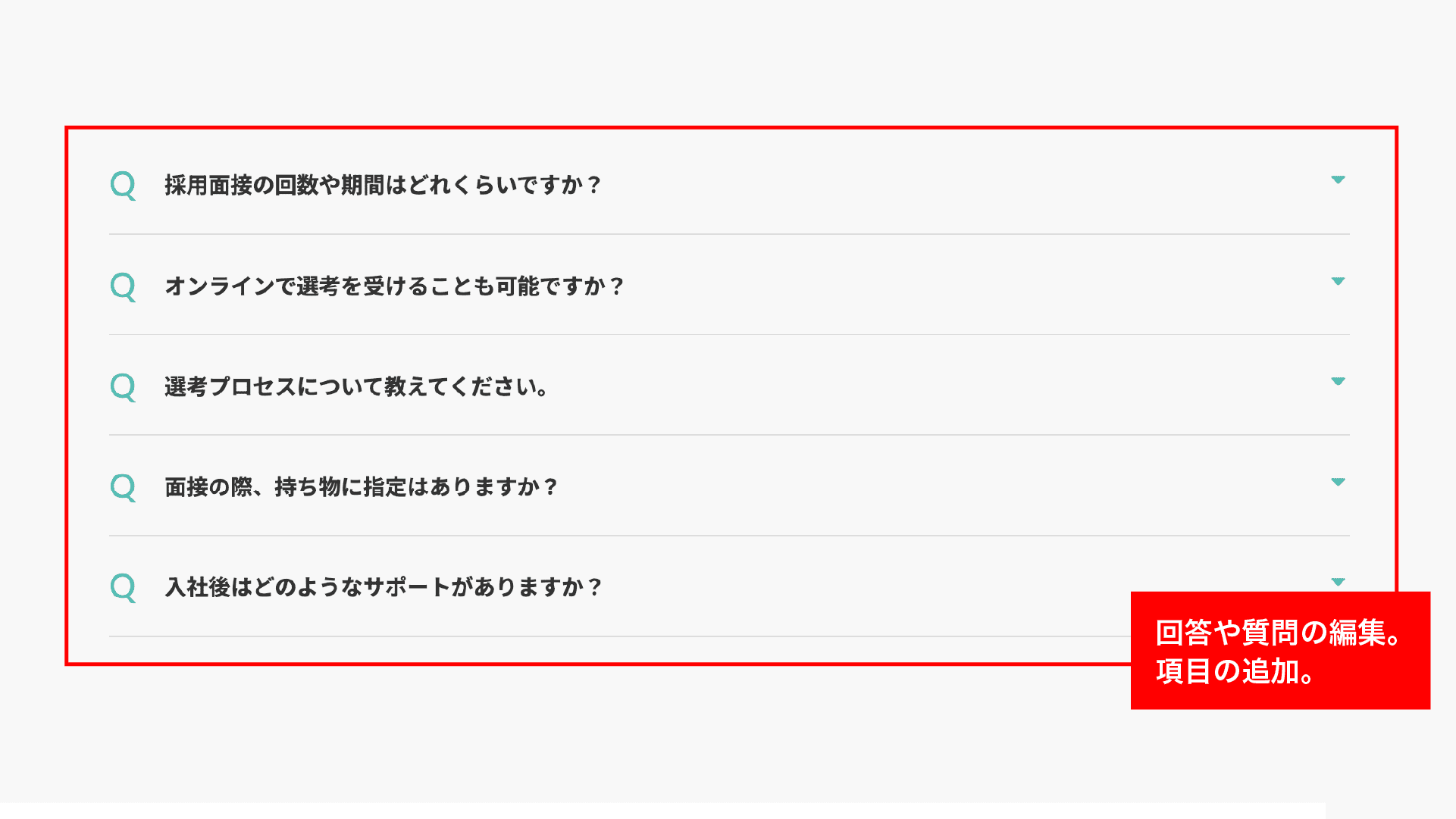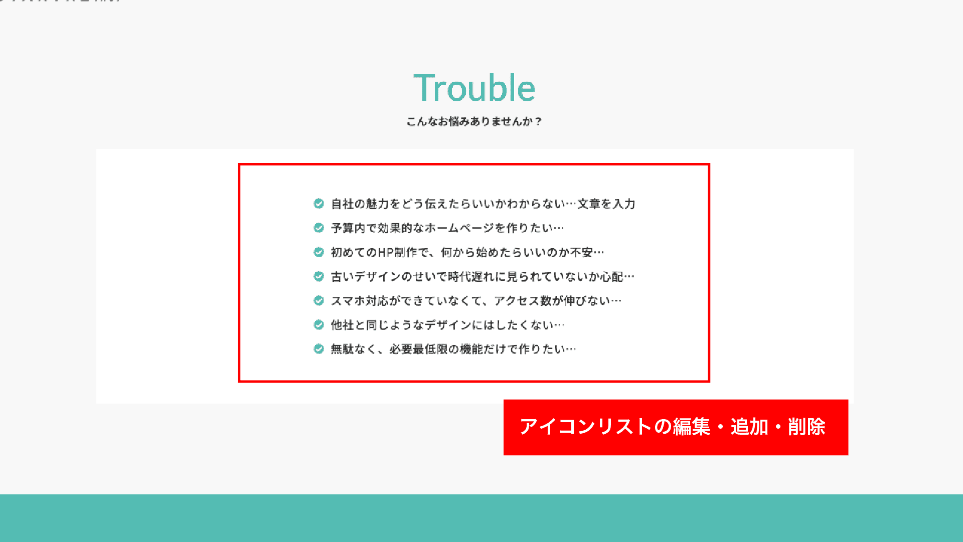 アイコンリスト(テキストの前にアイコンが付いている箇所)は、お客様ご自身での編集・追加・削除が可能となります。