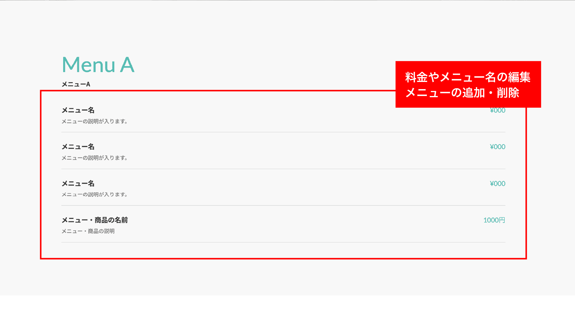 下記のようなデザインの料金・メニューについては編集・ 追加・削除することが可能です。 ※表形式の料金や、プライスリスト以外のメニューは、編集は可能ですが、項目の追加・削除はできません。 ※メニュー項目を増やすことは可能ですが、メニューカテゴリの追加はできません。