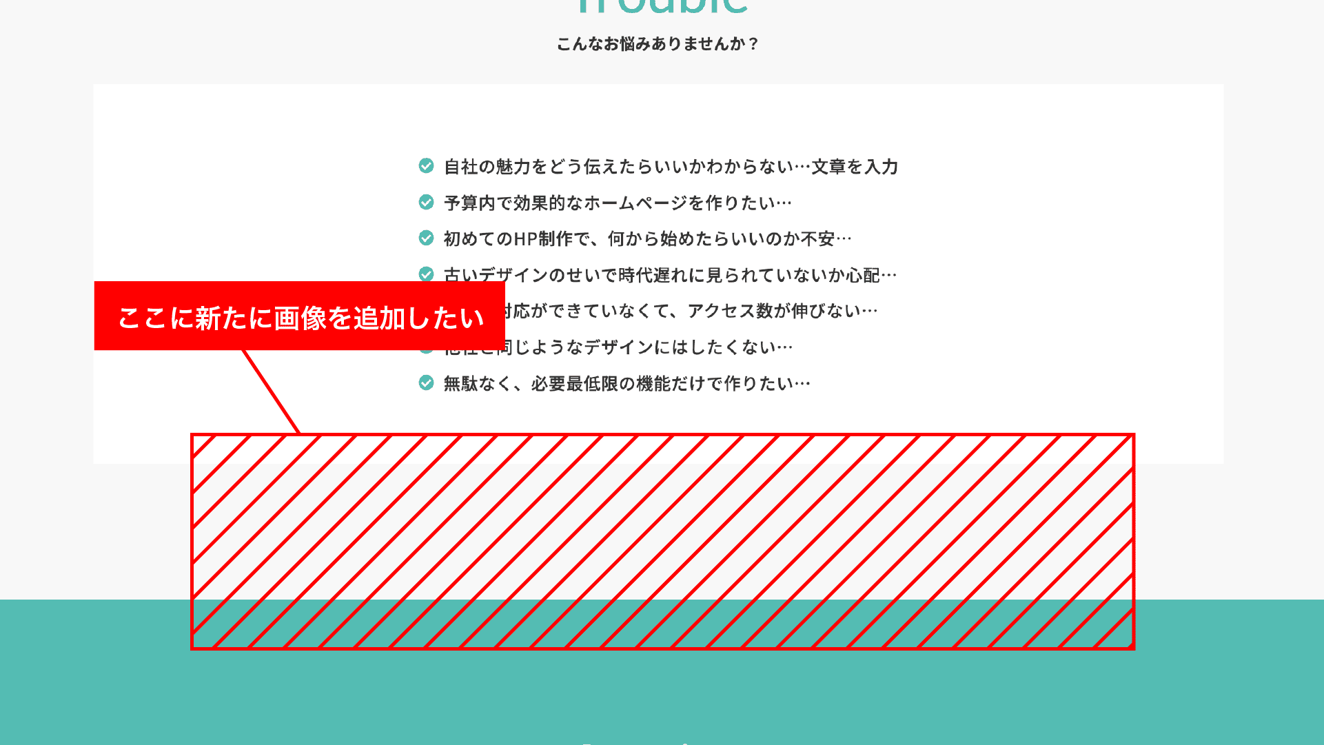 HP 内ではじめ(完成時)から画像が入っていない箇所に新たに画像を追加することはできません。 ※画像の追加をご希望の場合は弊社にて有料での対応となります。内容によって料金は異なりますので、まずはお問い合わせください。